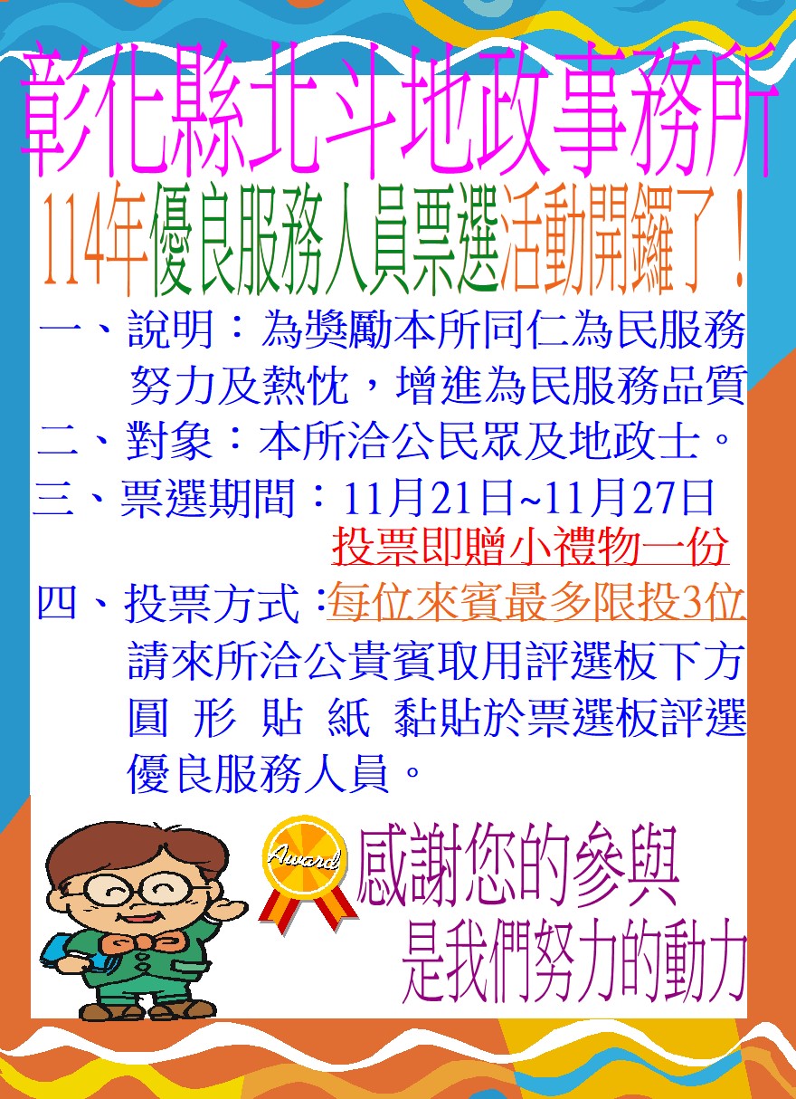 北斗地政事務所為增進為民服務品質、激發同仁服務熱忱及工作士氣,自114年11月21日起至11月27日止,辦理優良服務人員票選活動,每位民眾最多可票選3名優良服務人員,歡迎民眾踴躍參與投票,活動期間參加票選活動的民眾可獲得小禮物,數量有限請勿錯過。