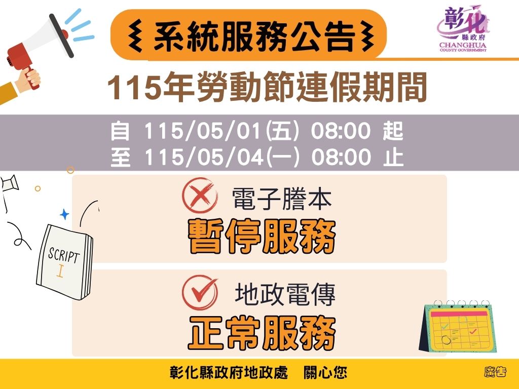 電子謄本:115/5/1(五)08:00-115/5/4(一)08:00暫停服務。