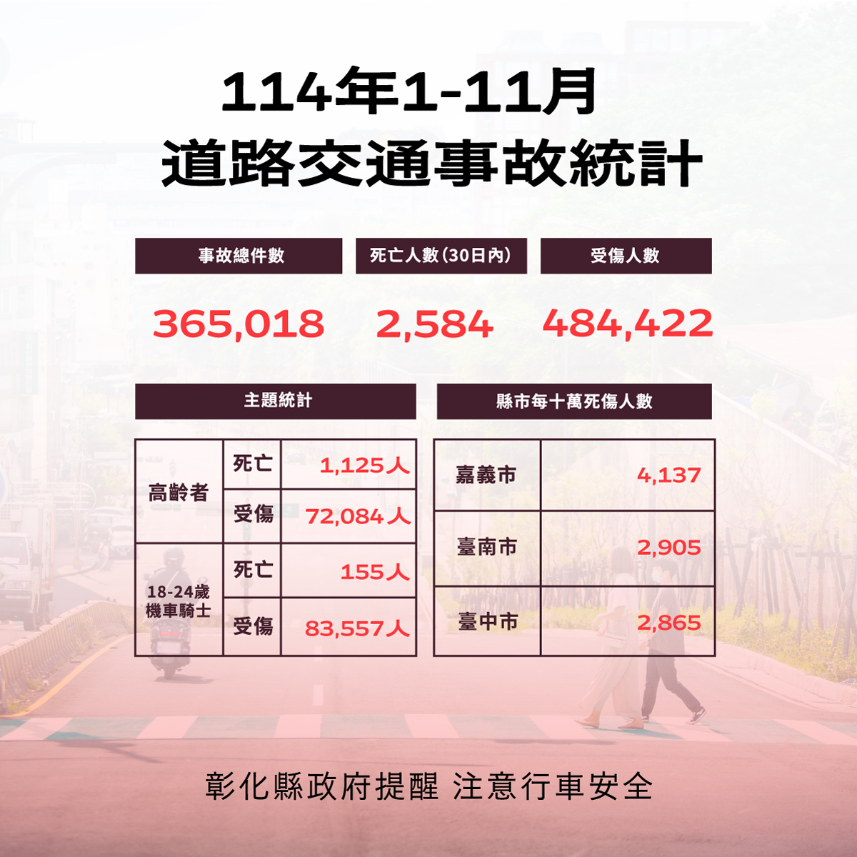 114年1-11月道路交通事故 彰化縣事故死傷累計28,659人