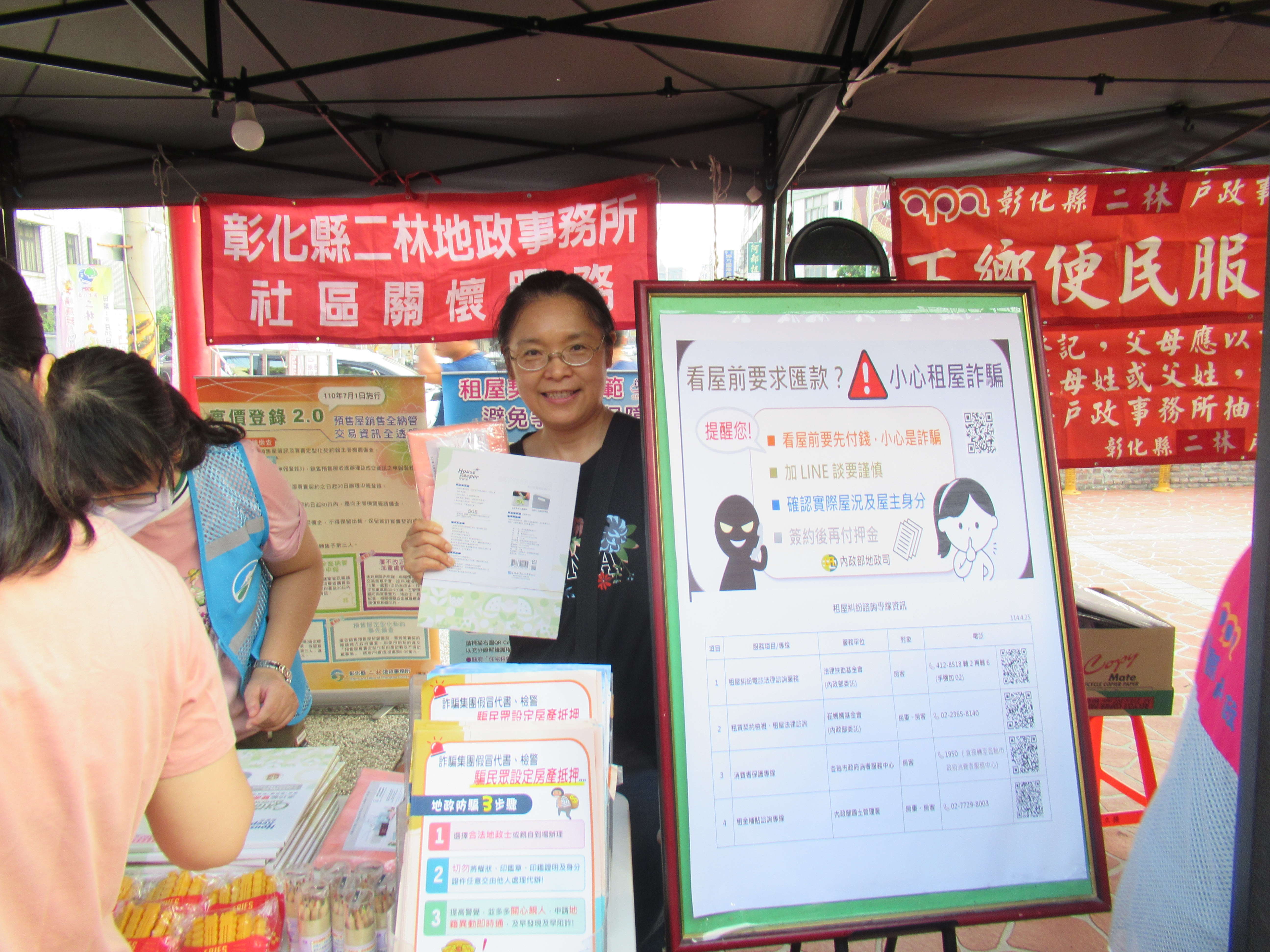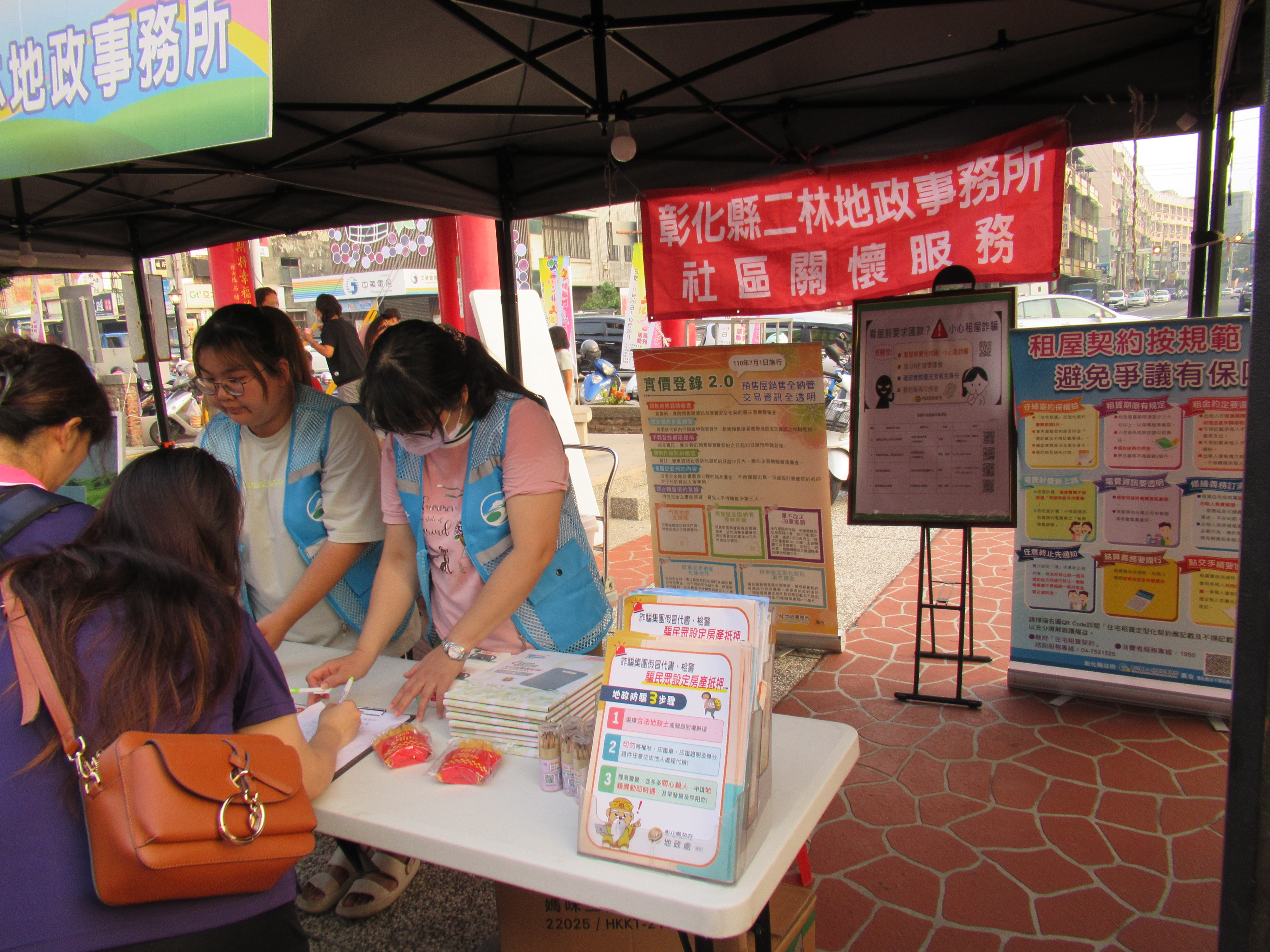當晚由林素惠及施滄明課長帶領同仁擺設宣導攤位,推廣轄區土地以航照套繪地籍圖(對位/各管位置)地政創新服務,宣導性別平權、節約能源、實價登錄、租賃住宅(防詐)、地籍圖重測及地籍異動即時通杜防詐騙等地政常識,同時邀請民眾追蹤、訂閱二林地政及地政處臉書粉絲團及影片,互動相當熱絡。
