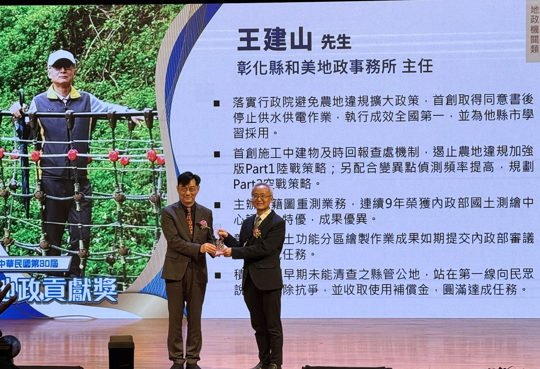 內政部於114年11月11日上午在公務人力發展學院福華國際文教會館2樓卓越堂舉辦「114年地政節慶祝大會」,表揚績優地政機關及人員,和美地政王建山主任因傑出優異的表現,獲得內政部地政司肯定,榮獲第30屆地政貢獻獎,並接受內政部政務次長董建宏頒獎表揚。