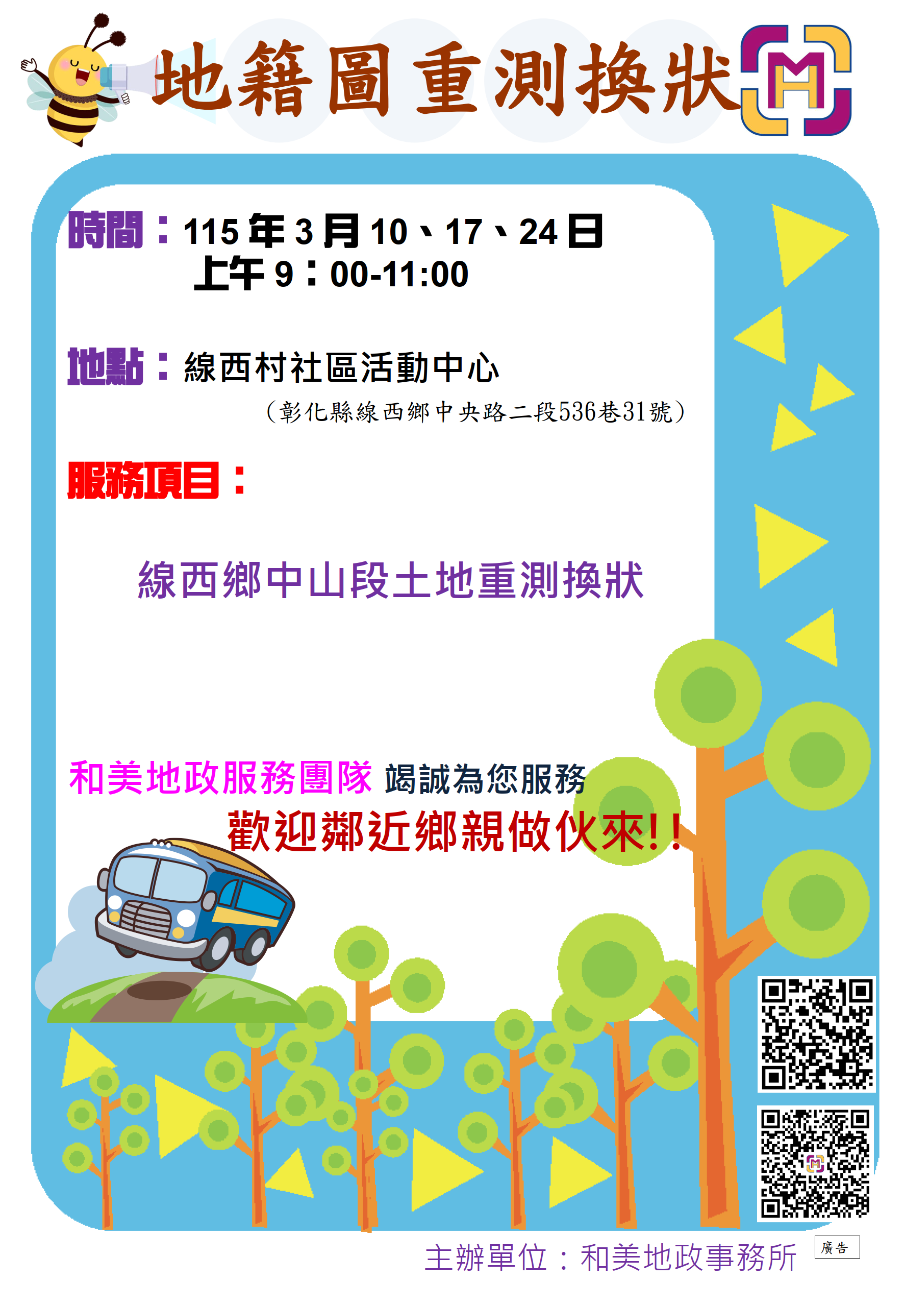 為方便民眾就近辦理換發權狀,和美地政事務所訂於3月10日、3月17日、3月24日,均為星期二上午9時至11時,派員前往線西鄉線西村社區活動中心辦理115年度地籍圖重測換狀作業,現場換發部分原重興段、德興段地段重測後為中山段所有權狀。