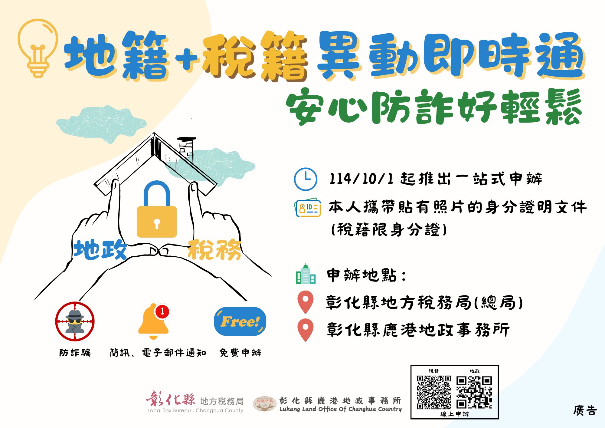 為預先防範不動產詐欺事件及簡化民眾申請流程,本所與地方稅務局攜手合作,推出「地籍異動即時通」與「稅籍異動即時通」一站式整合申請服務。讓不動產所有權人一處申請,即可開通兩項即時異動通知,強化不動產詐騙防護網,全面守護民眾財產安全。