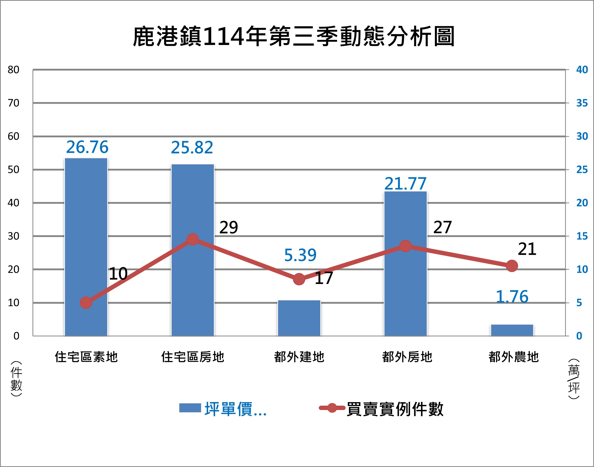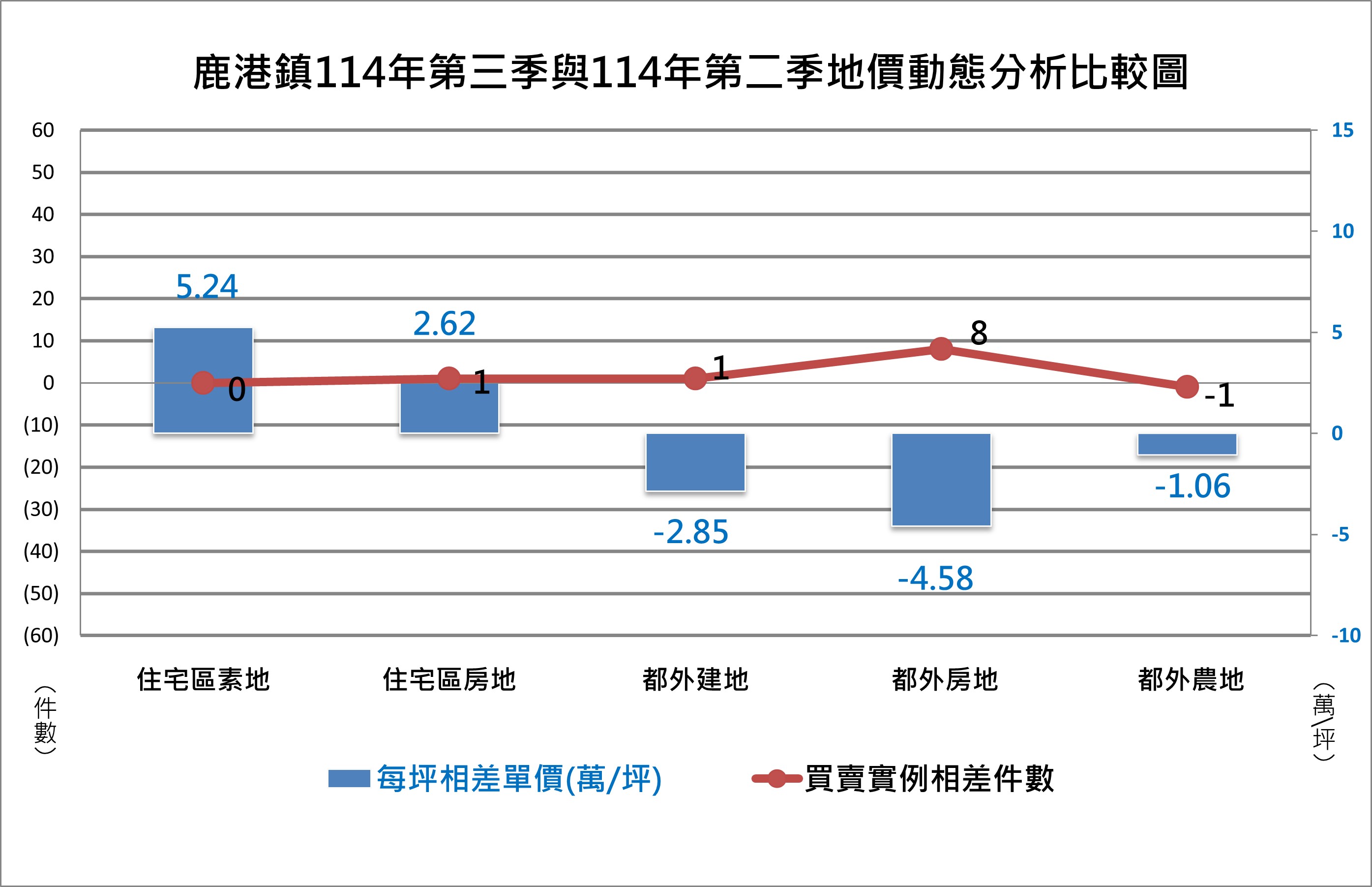 鹿港地政事務所統計分析轄區買賣實例件數、平均交易價格及其差異價格資料,並適時公布,讓鄉親能更了解及有效掌握不動產趨勢,其中平均交易價格包含住宅區房地(含車位)、住宅區素地、都外農地、都外房地(含車位)及素地(甲、乙種建築用地),此次提供114年第三季(本季)和114年第二季(上季)各區平均價格的差異值。