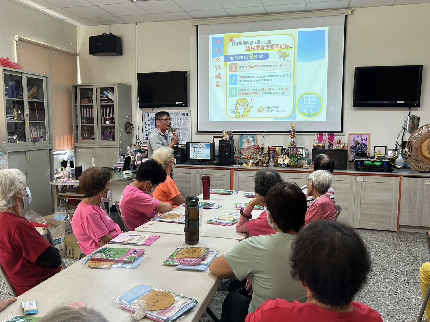 彰化縣田中地政事務所為加強宣導地政相關業務,於114年10月13日星期一上午配合彰化縣二水鄉源泉社區辦理「老人關懷據點量血壓」活動,在該社區活動中心除辦理地政業務宣導服務外,另針對現今各項詐騙活動猖獗情形多加說明,同時宣導防詐三寶,讓民眾避免受騙及如何應對;活動期間民眾發言踴躍,並提出自身之土地相關問題,地政服務人員對民眾之疑問,均詳細一一說明及解答,解除民眾心中之疑惑,使本次之地政業務宣導活動圓滿成功。