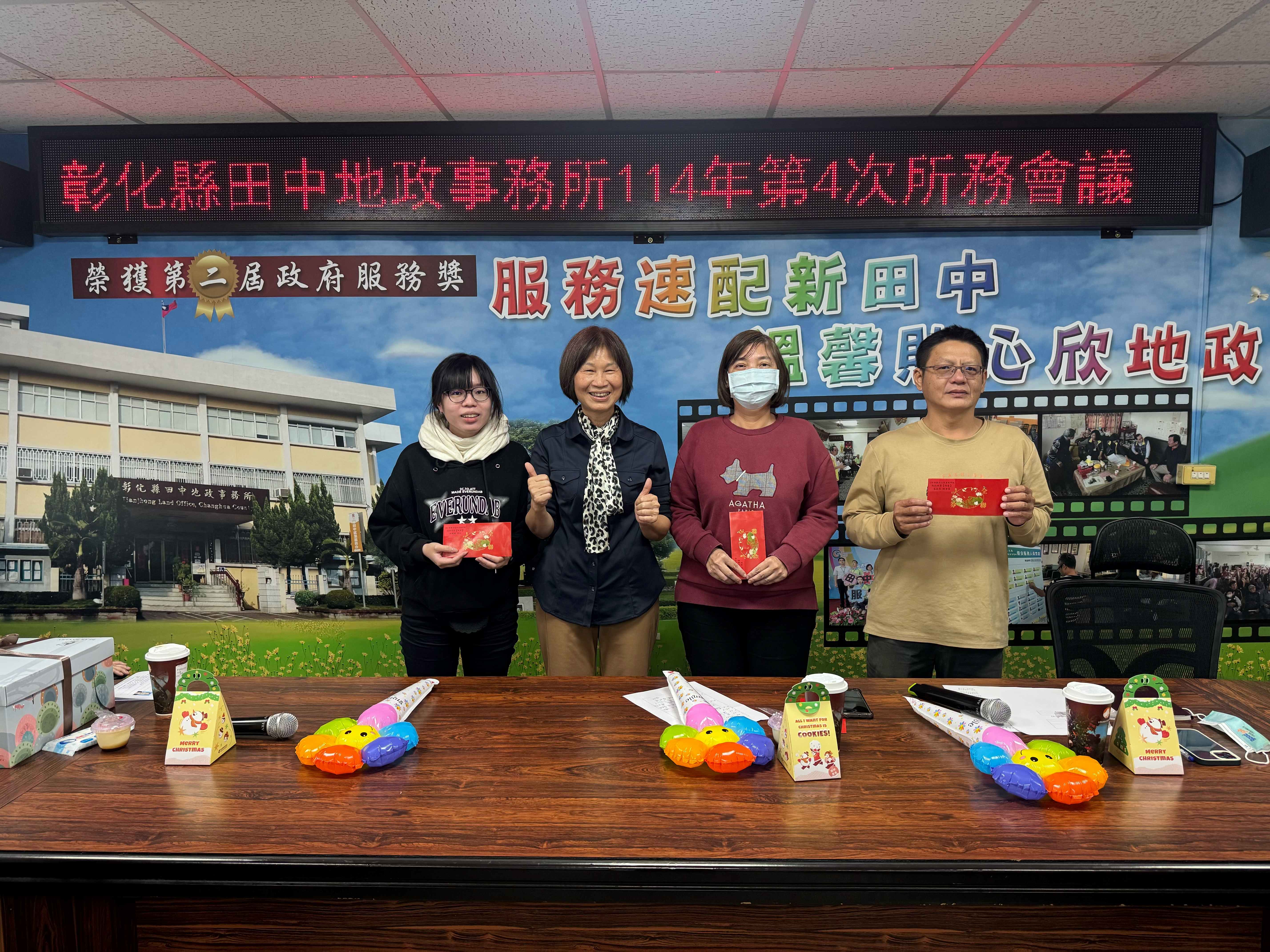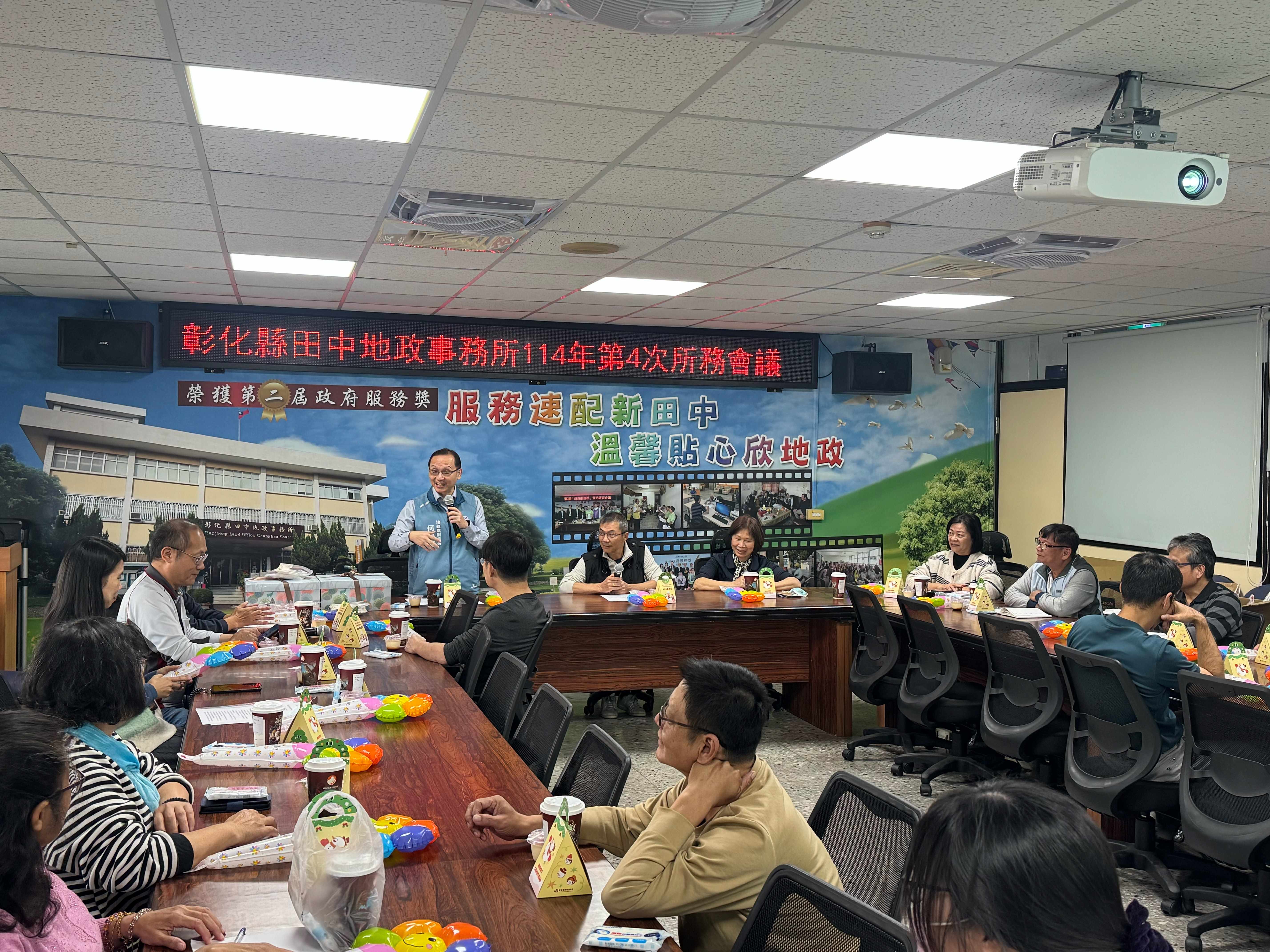 為強化內部溝通協調,凝聚同仁向心力,田中地政事務所於12月15日召開114年度第4次所務會議,透過業務交流與意見分享,促進團隊互動,營造良好的工作氛圍。