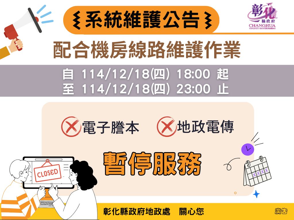 「全國地政電子謄本系統」及「台灣e網通電傳資訊系統」將於114年12月18日(四)下午6時至114年12月18日(四)下午11時暫停服務。
