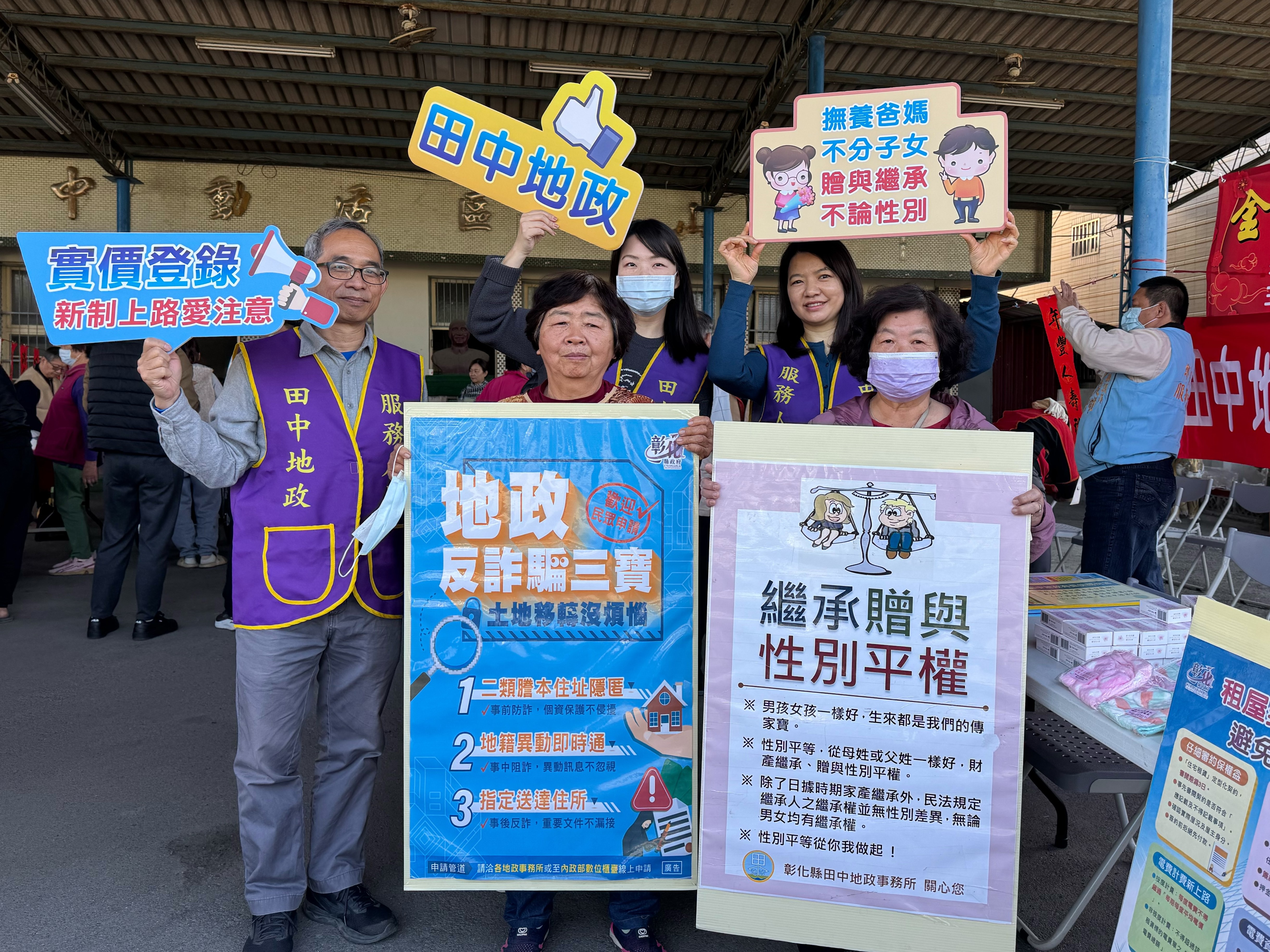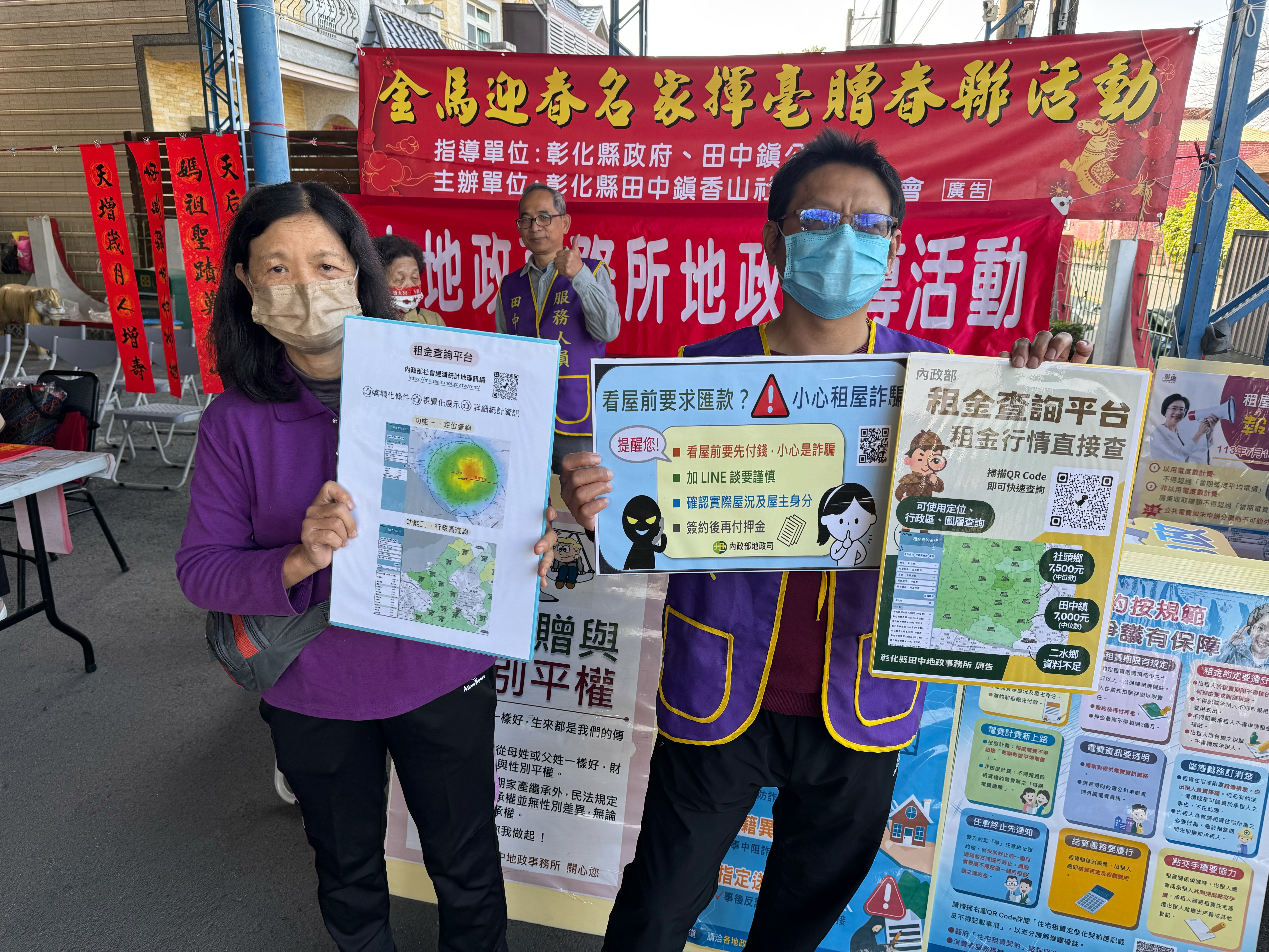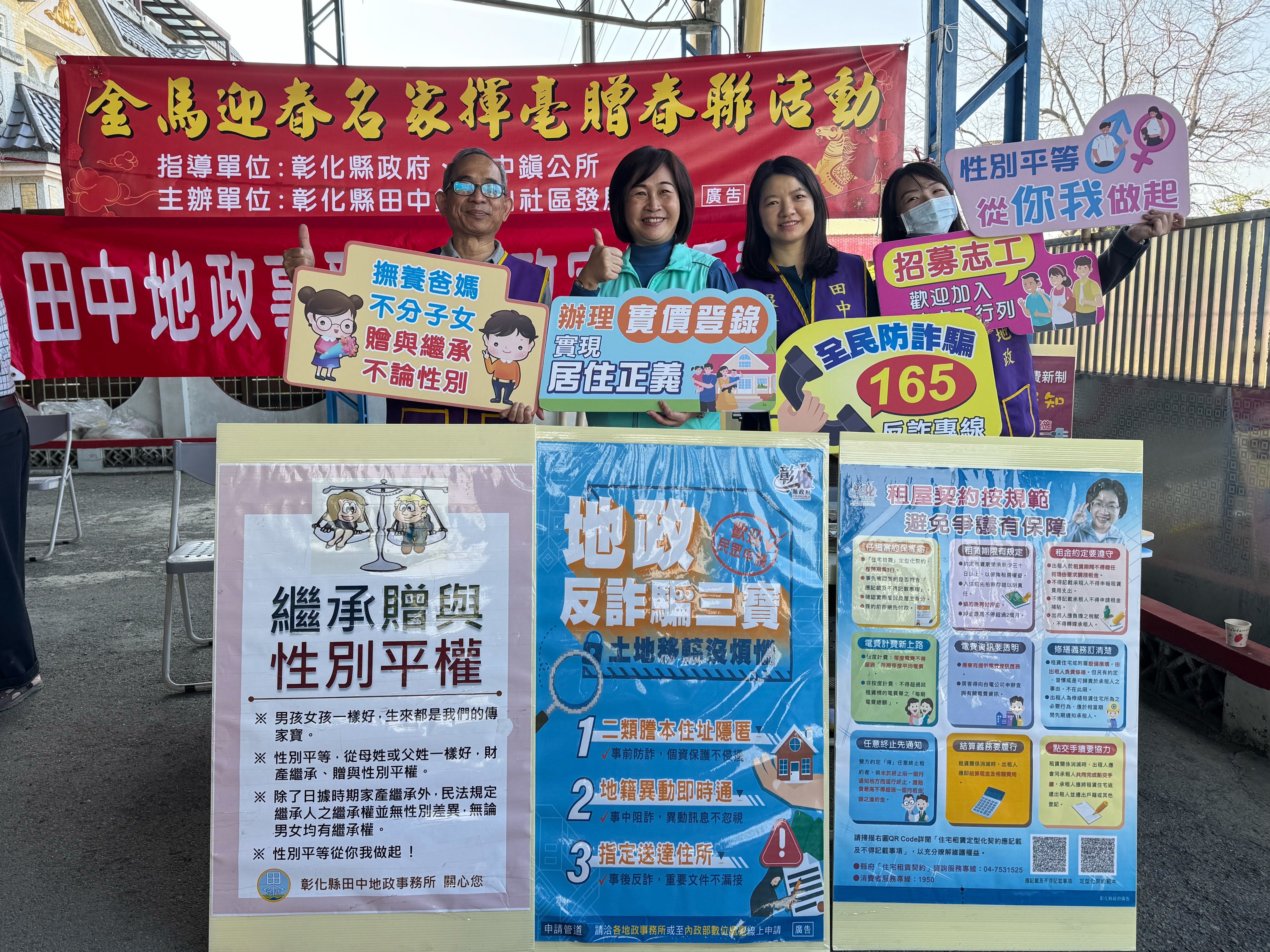 活動現場邀請逸東書法社的書法老師現場揮毫,一副副充滿祝福的春聯送到民眾手中,象徵新年的好彩頭。田中地政也於活動中設攤,向鄉親宣導不動產實價登錄,提醒大家在買賣不動產時要留意交易資訊,維護市場透明與自身權益;同時推廣內政部建置的「租金查詢平台」,協助民眾了解合理租金行情,保障租賃雙方權益。亦於活動中宣導性別平等觀念,強調不動產權利不分性別皆應受到保障,同時加強民眾預防不動產詐騙之觀念,呼籲民眾提高警覺,遇有疑慮可撥打165反詐騙專線查證。