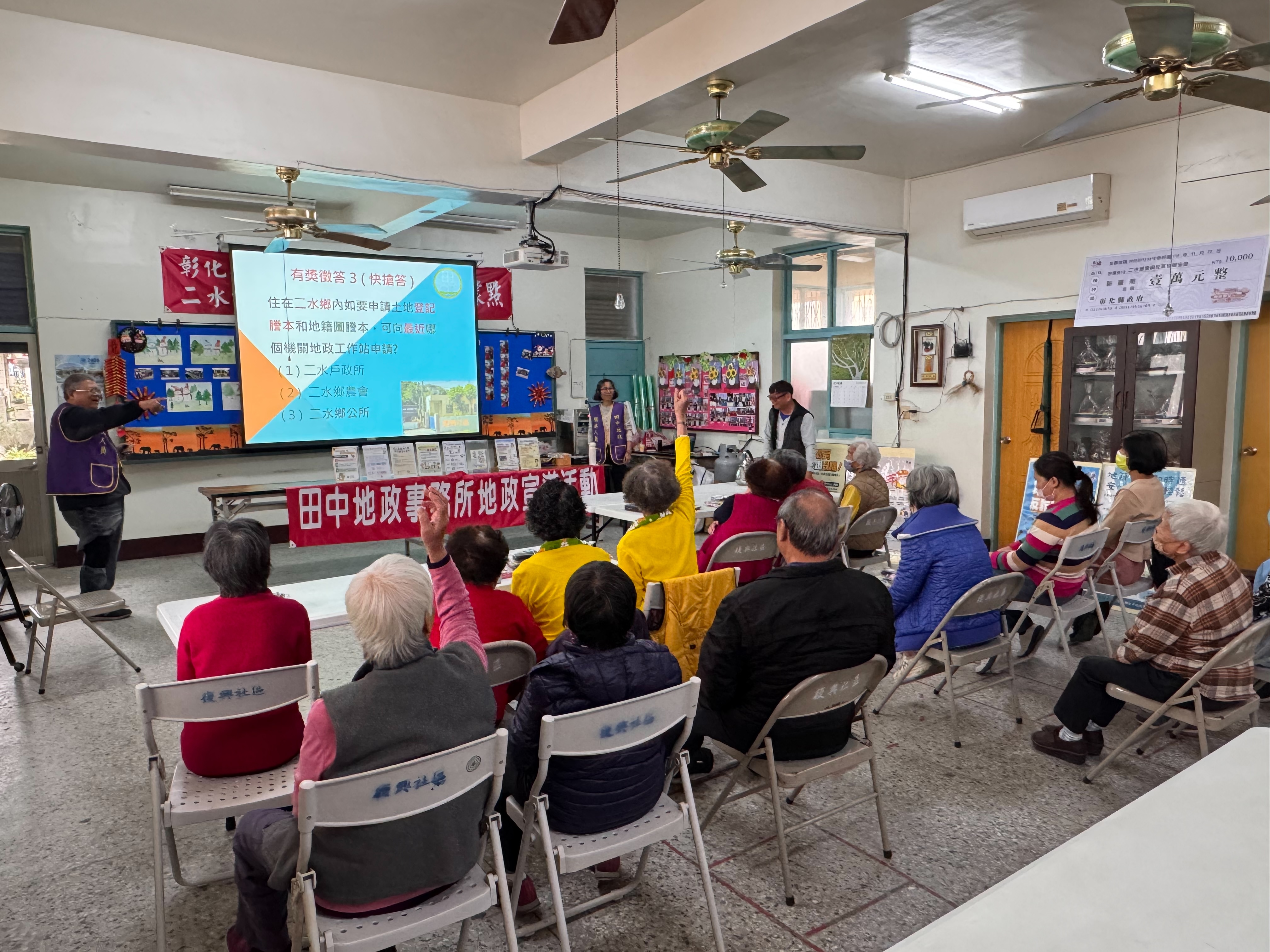 田中地政事務所為加強宣導地政相關業務,於3月4日上午前往二水鄉復興社區發展協會辦理地政業務宣導,為轄區偏遠地區民眾做現場業務服務,參加長者相當踴躍,並對本所社區宣導服務工作表示讚許。