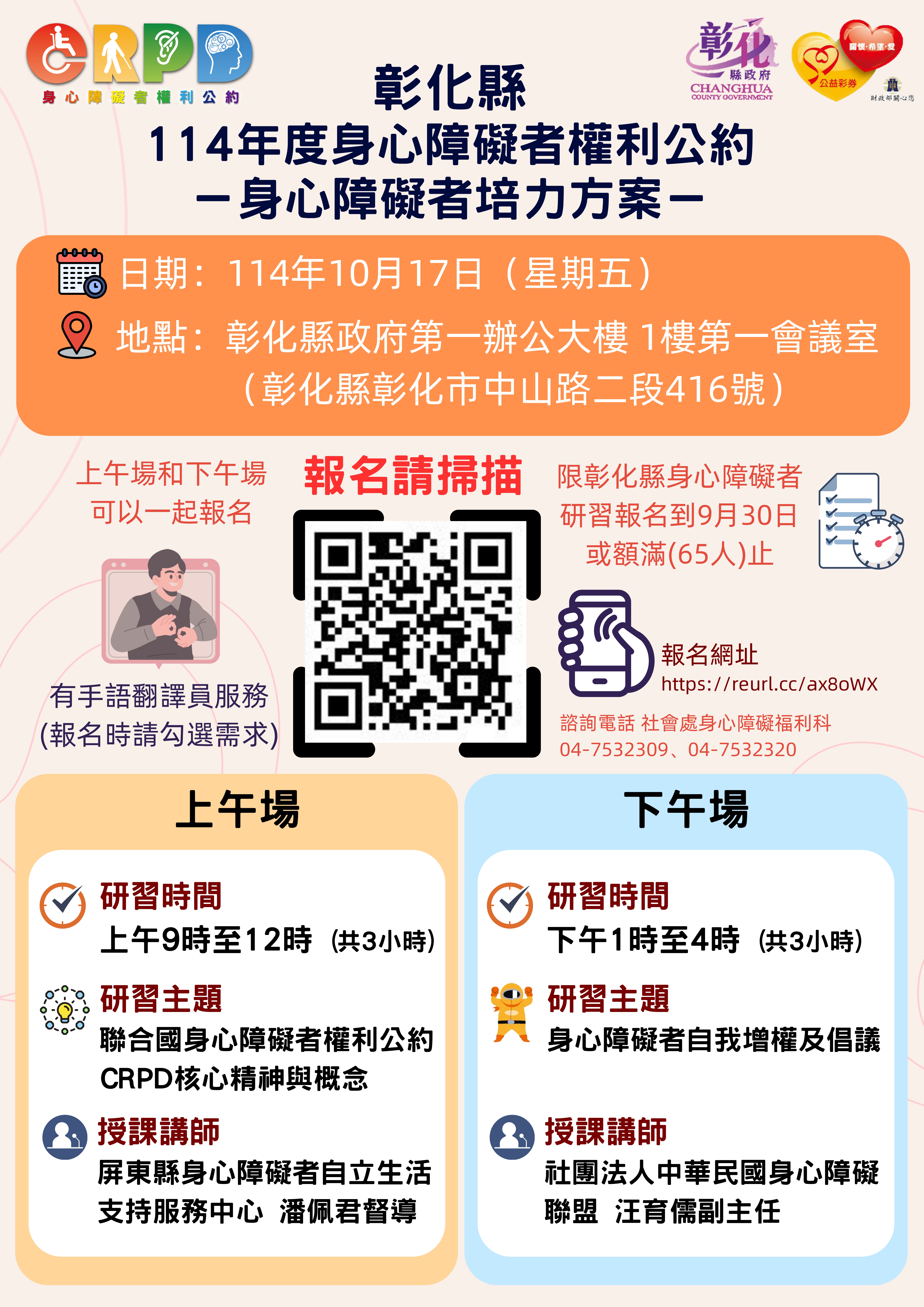 彰化縣政府辦理「彰化縣114年度身心障礙者權利公約之身心障礙者培力方案」課程,訂於114年10月17日於本府第一辦公大樓1樓第一會議室辦理,請身心障礙者踴躍報名!!