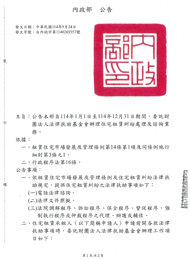 【協助宣導】內政部公告委託財團法人法律扶助基金會辦理114年度住宅租賃糾紛處理及諮詢業務