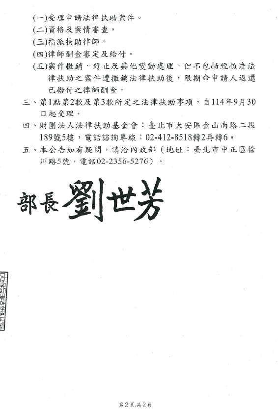 內政部公告委託財團法人法律扶助基金會辦理114年度住宅租賃糾紛處理及諮詢業務,除113年8月1日已開辦之電話法律諮詢服務外,針對符合租金補助資格之住宅租賃承租人,若經訴訟外調解或調處程序仍無法解決租屋糾紛,自114年9月30日起,得依「住宅租賃糾紛法律扶助規定」向法扶基金會申請法律文件撰擬、律師代理等法律扶助協助。