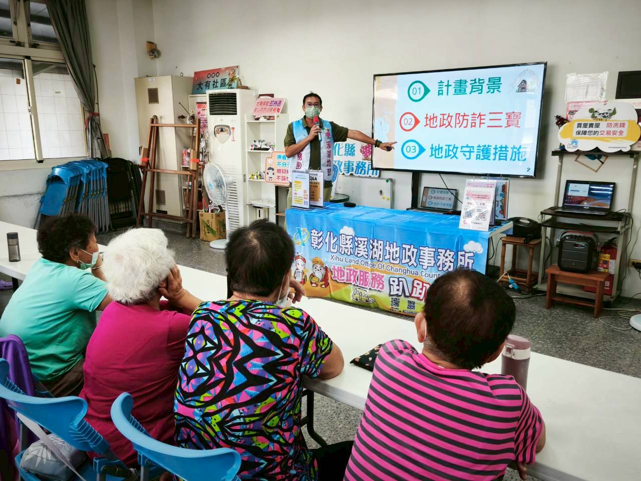 溪湖地政事務所於10月9日下午2時30分在埔鹽鄉大有社區活動中心辦理「地政服務趴趴GO」,為因應詐騙手法不斷翻新,保障民眾財產與不動產交易安全,由該所地價課劉子維課長以「防詐守護措施」為宣導主題,其中特別解說地政防詐三寶:「地籍異動即時通」、「住址隱匿」及「指定送達處所」,民眾申請相關服務後,當名下土地或建物有任何異動時,系統會立即發送通知,協助民眾即時掌握不動產狀況,防止不肖人士冒名或偽造文件進行不法移轉,以智慧科技強化地政服務,打造安心透明的不動產交易環境。