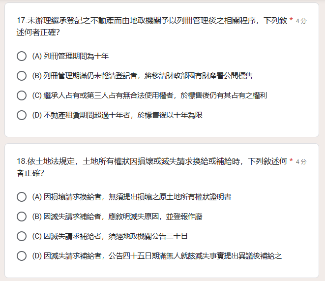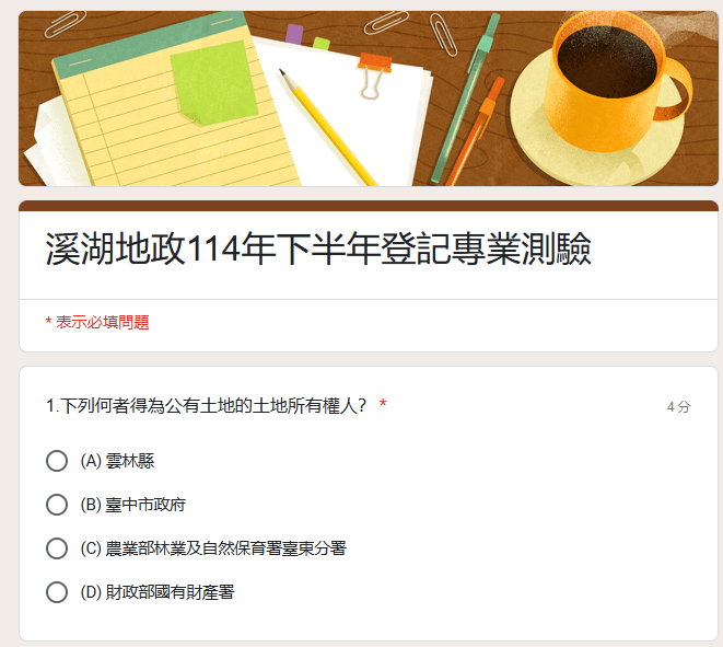 為強化同仁本職學能,溪湖地政所於11月13日辦理114年下半年度專業測驗,期能透過制度化的檢核機制,深化同仁對地政專業法令的理解與應用,進而提升整體為民服務的品質。本次測驗因應節能減碳及無紙化推動,特別採用 Google 電子表單進行命題與作答,不僅操作便捷,也讓測驗流程更為有效率。題目內容除涵蓋一般土地登記相關法令及實務外,並延伸至未辦繼承、地籍清理、外人地權等部分,使測驗更加周延實用。受測同仁皆全力投入、積極應試,整體測驗進行順暢,最終圓滿完成。若同業先進有興趣體驗作答,亦可透過以下網址參與測驗(https://forms.gle/jk4984eK1aVCAEAE7),系統將於提交後立即顯示成績,並可同步檢視正確答案及錯誤題目,協助自我學習與檢討。