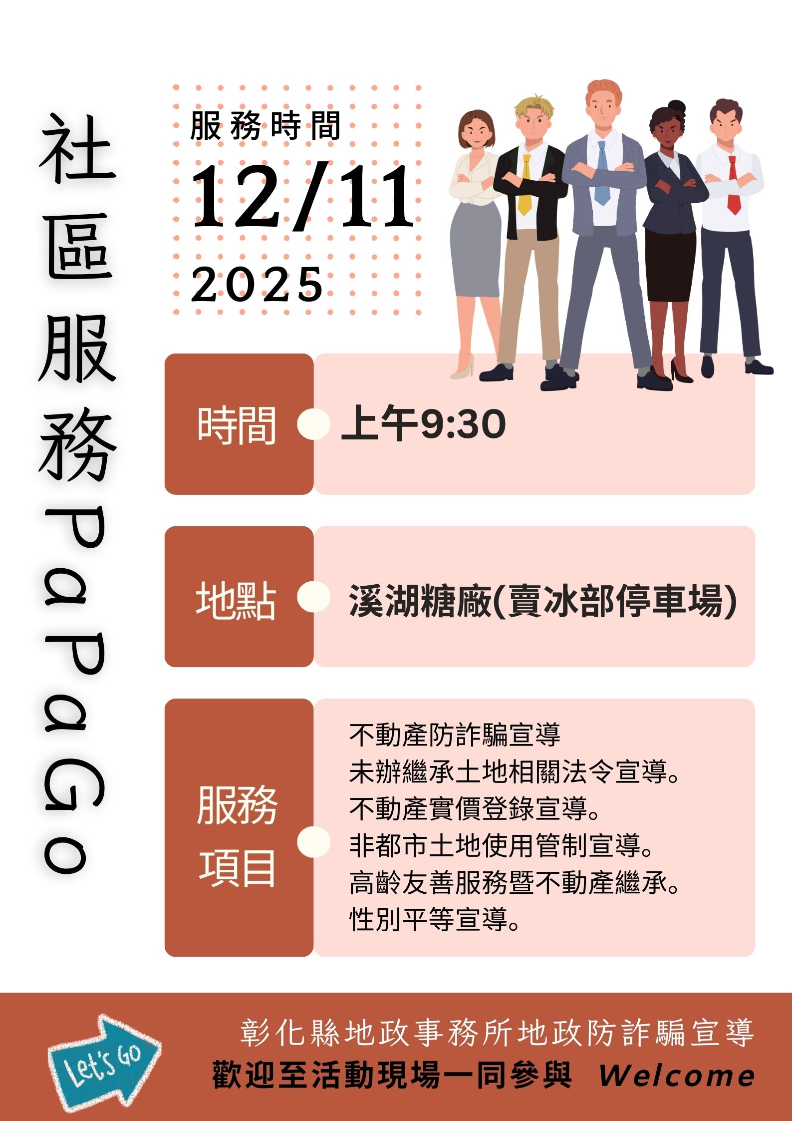 溪湖地政事務所為更貼近鄉親、深入社區聽民意,將於 114年12月11日(四)上午9:30–10:30,在 溪湖糖廠(賣冰部停車場) 與溪湖中區扶輪社定期捐血活動聯合舉辦 「地政服務趴趴GO」!