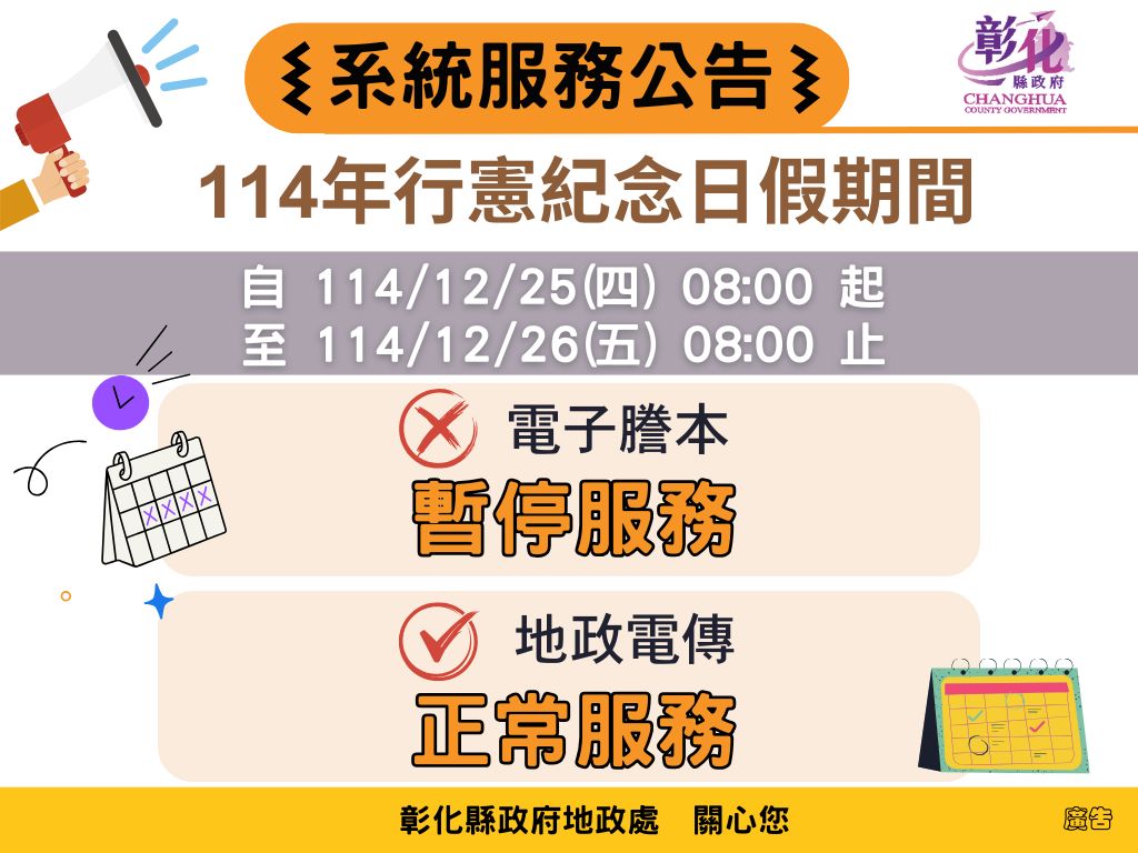 電子謄本:114/12/25(四)08:00-114/12/26 (五)08:00暫停服務。