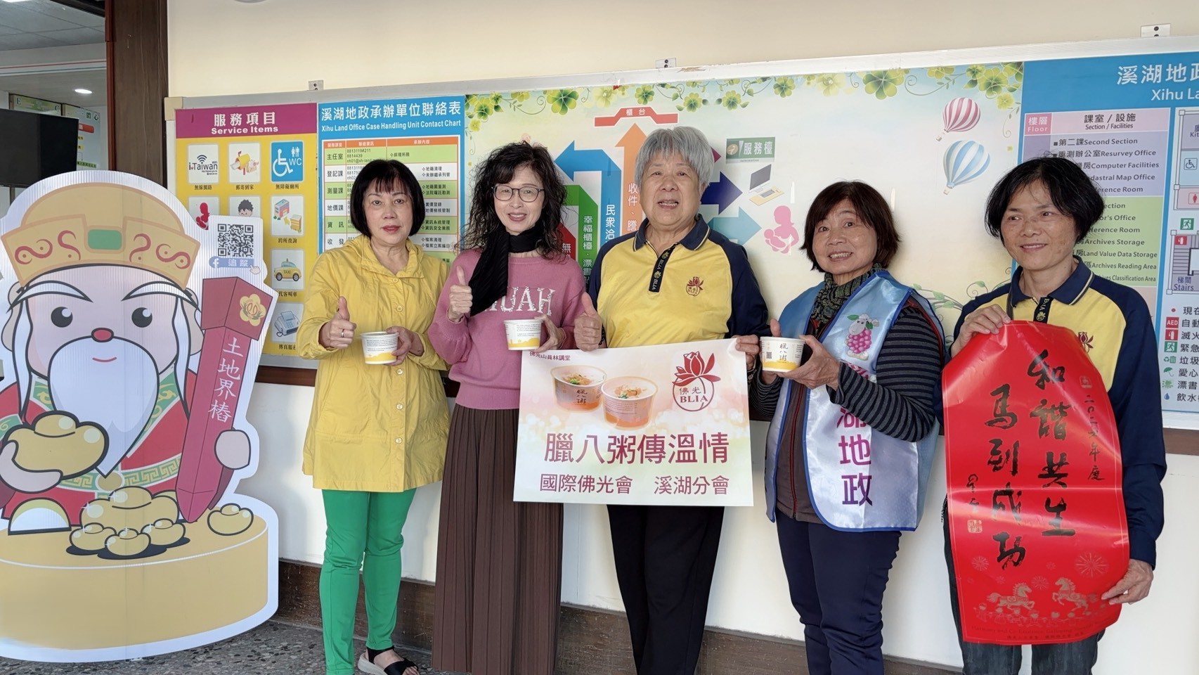 為迎接臘八佳節並傳遞新春祝福,國際佛光會溪湖分會近日蒞臨溪湖地政事務所,辦理「臘八粥傳溫情」公益關懷活動,致贈精心熬煮的臘八粥,並同時致送星雲大師一筆字墨寶2026年春聯「和諧共生・馬到成功」,向第一線服務同仁及洽公民眾傳達關懷與祝福,讓寒冬中增添濃濃暖意。