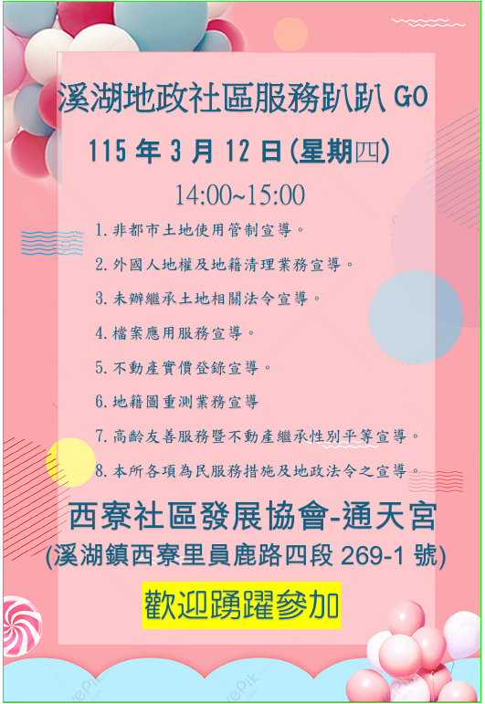 溪湖地政事務所為主動接近民眾、深入社區瞭解民意並擴大服務層面,訂於115年3月12日(星期四)下午2時至3時於溪湖鎮西寮社區發展協會-通天宮(溪湖鎮西寮里員鹿路四段269-1號)舉辦「地政服務趴趴GO」,竭誠歡迎鄉親前往諮詢土地登記、測量及地價相關問題。