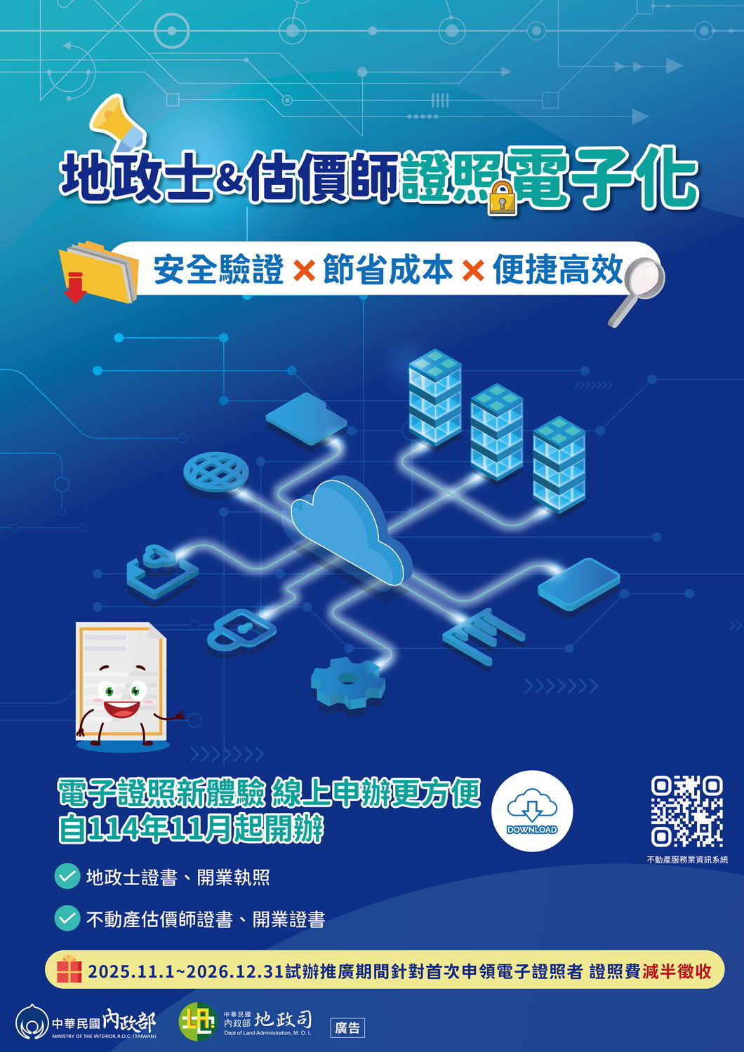 為推動證照數位化政策,提升行政效能與證照防偽安全性,彰化縣政府配合內政部政策推動「地政士及不動產估價師證照電子化」,透過「不動產服務業資訊系統」提供線上申請、繳費及下載服務,落實便民與智慧治理目標。