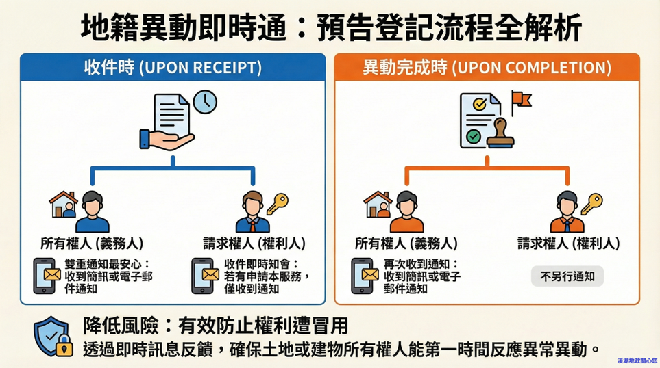 溪湖地政事務所進一步說明,若預告登記案件中的「權利人」(即請求權人)本身已申請地籍異動即時通服務,則其於案件「收件時」亦能同步收到通知,但「異動完成」時則不另行通知。對此,如民眾對通知內容有疑問,該所亦將提供協助說明,確保資訊傳達清楚無誤。