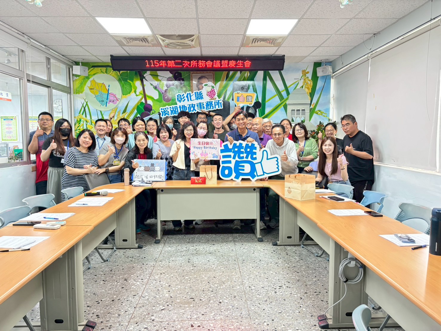溪湖地政事務所於115年4月9日召開115年度第二次所務會議暨同仁慶生會,由全體同仁共同與會。會議內容涵蓋各課業務報告、新進同仁介紹、專題讀書心得分享,並結合性騷擾防治及節能減碳宣導,兼顧政策溝通、專業精進與人文關懷,強化團隊橫向聯繫與整體行政效能。